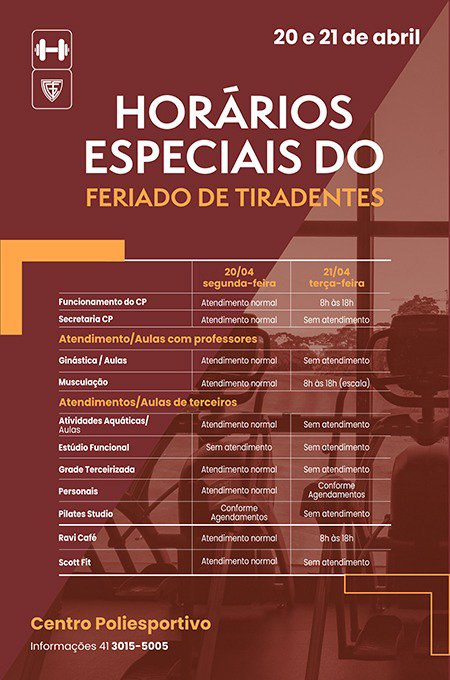Confira o funcionamento do Centro Poliesportivo neste feriado de Tiradentes e programe seu treino💪🗓️