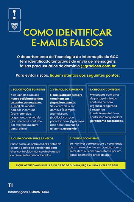 O departamento de Tecnologia da Informação do GCC tem identificado tentativas de envio de mensagens falsas para usuários do domínio @graciosa.com.br.