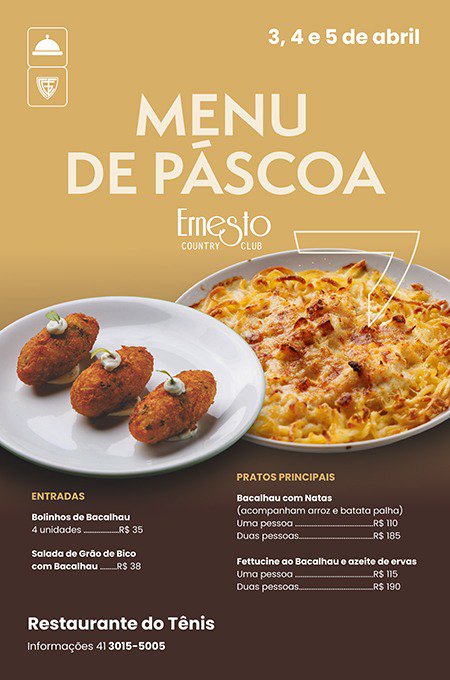 O Restaurante do Tênis estará atendendo normalmente neste feriado de Páscoa e com um menu especial para a ocasião! Não deixe de conhecer e aproveitar, de sexta a domingo🐰😋